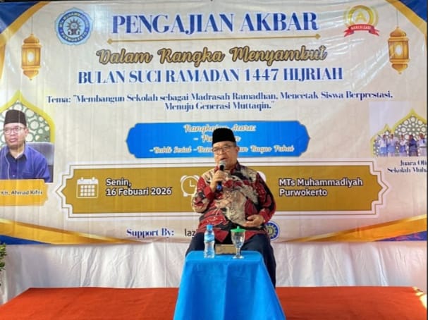 Purwokerto, Banyumas || Majelis Tabligh PWM Jawa Tengah ~ Sekitar 200 jamaah yang terdiri dari calon wali murid, wali murid, serta tamu undangan menghadiri Tabligh Akbar dalam rangka menyambut bulan suci Ramadhan 1447 H yang digelar oleh MTs Muhammadiyah Purwokerto. Kegiatan yang berlangsung khidmat tersebut dilaksanakan di halaman sekolah pada Ahad, 16 Februari 2026, dan dimulai sejak pukul 07.30 WIB.