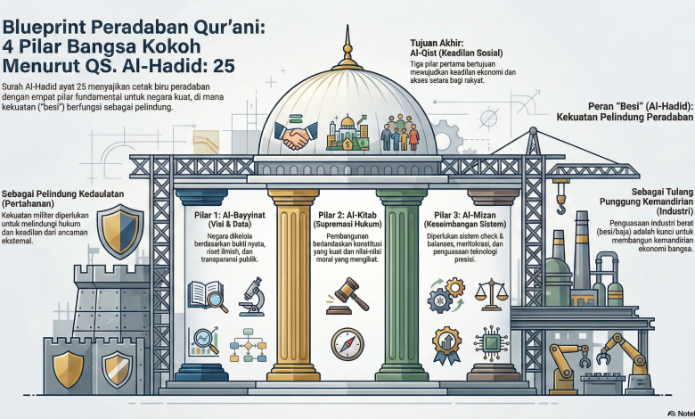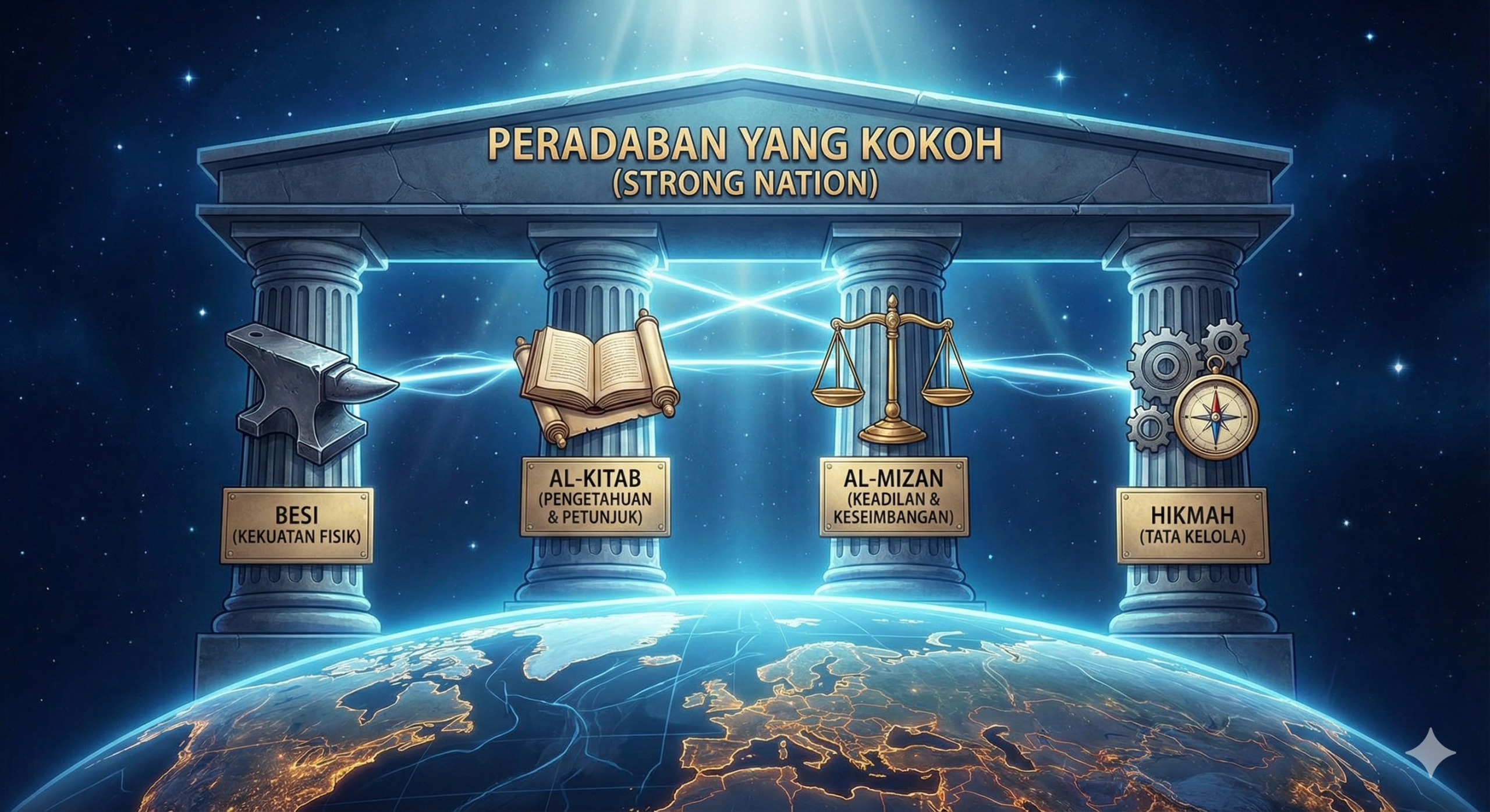 Allah SWT tidak hanya menurunkan besi sebagai material fisik, tetapi menempatkannya dalam satu rangkaian ayat dengan “Al-Kitab” dan “Al-Mizan”. Ini adalah isyarat bahwa Peradaban yang Kokoh (Strong Nation) harus dibangun di atas 4 Pilar Fundamental yang bekerja persis seperti hukum alam menjaga kestabilan bumi.